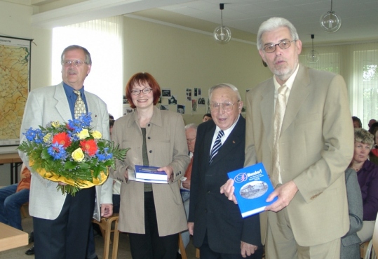 Vorstellung der Chronik am Sonntag, dem 9. Juni 2002 um 15.30 Uhr im Gemeindehaus Dillendorf, Auf dem Schloß 10 (von links nach rechts: Ortsbürgermeister Ingo Dröge, Chronistin Sabine Bollhorst, Altbürgermeister und Ehrenbürger Otto Schwinnen (†2005) und Bürgermeister Carsten Koppke)